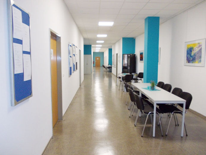 Neben den fortschrittlich ausgerüsteten PC-Arbeitsplätzen wartet der Schulungsraum mit einem Aufenthaltsbereich auf. Auch der großzügige Flur lädt mit seinen Sitzgelegenheiten und dem Automaten für Heißgetränke zum Entspannen oder Plaudern mit anderen Teilnehmern ein. Eine Küche mit Kaffeemaschine, Wasserkocher, Mikrowelle und Kühlschrank komplettiert die Ausstattung Ihres harmonischen Lernumfelds. Wer sich in der Mittagspause einen Snack besorgen möchte, findet entsprechende Einkaufsmöglichkeiten in ca. 800 m Entfernung.