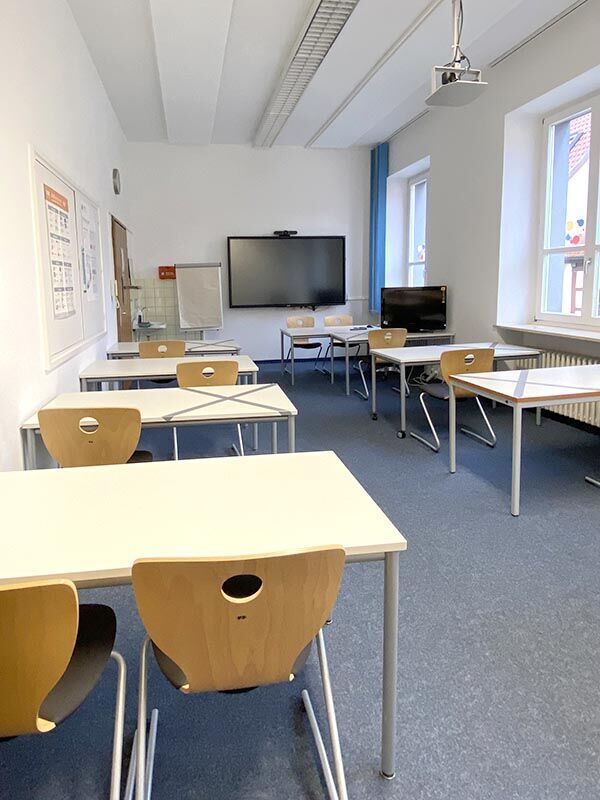 Der Schulungsstandort in Mellrichstadt befindet sich mit im historischen denkmalgeschützten Bürgerhaus. Die Räume im ersten Stock sorgen mit hohen Decken, vielen Fenstern und hellen Wandfarben für eine freundliche Atmosphäre.