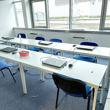 Der Aufzug bringt Sie in den vierten Stock, wo Sie der Eingangsbereich mit kleiner Sitzecke begrüßt. In den Schulungsräumen herrscht eine angenehme, ruhige Arbeitsatmosphäre. Durch die großen Fenster kommt viel Licht herein; bei Bedarf können sie aber auch mit elektrischen Jalousien variabel abgedunkelt werden. Sie brauchen mal eine Pause? Dann schnappen Sie etwas Luft auf der Dachterrasse oder stärken Sie sich im Pausenraum.