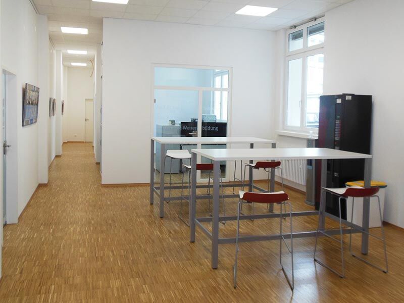 Die Schulungsräume verteilen sich auf den ersten und zweiten Stock, bei Bedarf bringt Sie ein Aufzug nach oben. Sie präsentieren sich modern und lichtdurchflutet. Auch ein Pausenraum mit Tischen, Stühlen und Kaffeeautomat gehört dazu. Die Räume sind barrierefrei und auf dem neuesten Stand der Technik. Durch die zentrale Lage erreichen Sie in nur 5 Minuten zu Fuß die Innenstadt – ideal, um in der Pause schnell frische Luft zu tanken oder eine kleine Auszeit zu genießen.